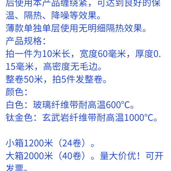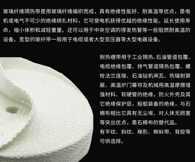 玻璃纤维耐热缠带参数特殊颜色可以定制任意宽度尺寸可以定制长期耐温度260°C短期高耐温度可达550°C抗飞溅性卓越阻燃性很好耐磨性很好灵活性卓越耐水耐油性卓越